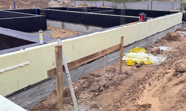 Trwają prace nad hydroizolacją oraz termoizolacją fundamentów. Zamierzamy zastosować styrodur o grubości 12 cm, który zabezpieczy fundamenty przed wilgocią oraz poprawi ich parametry cieplne.
