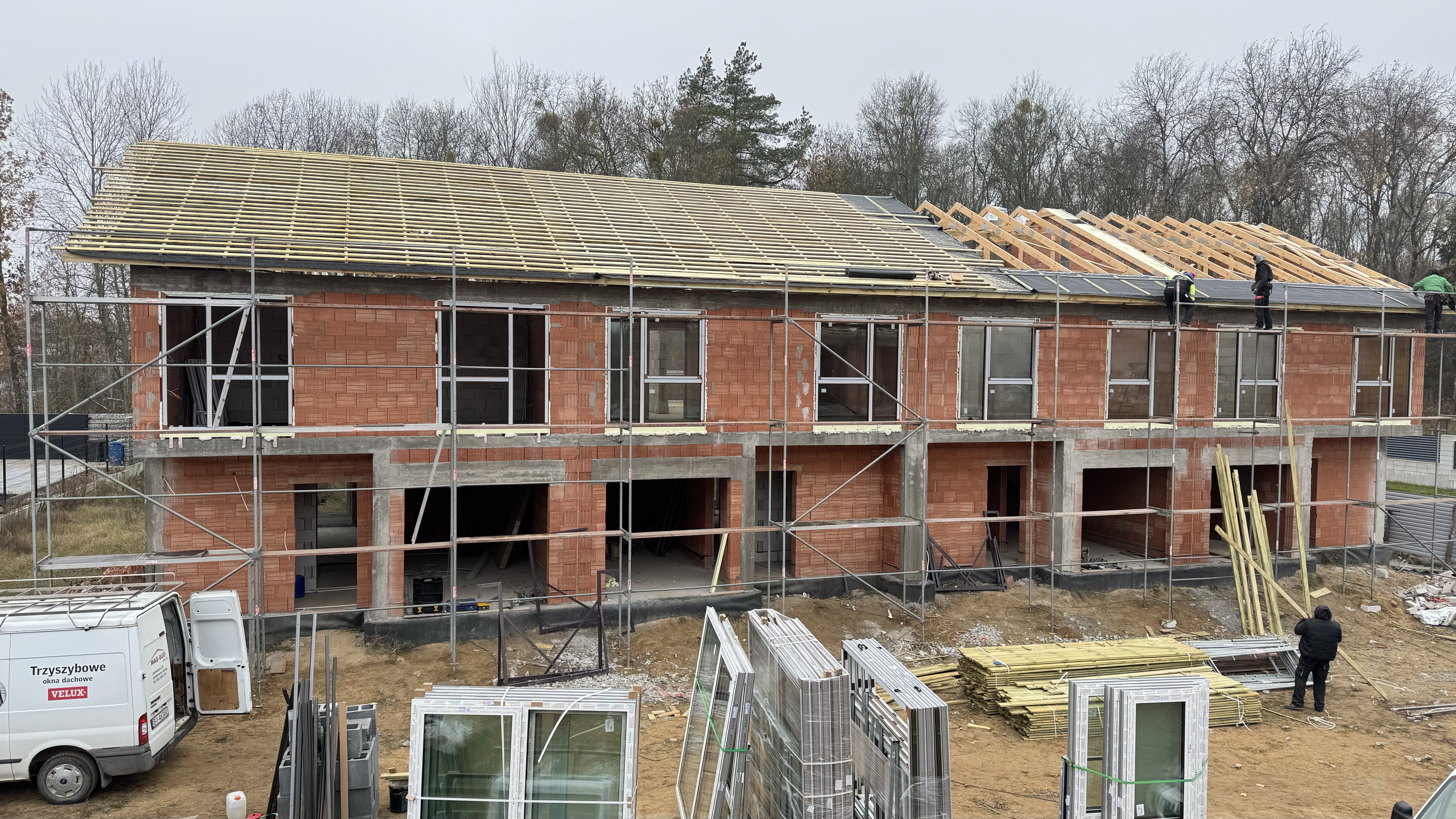 Pod koniec 2024 roku rozpoczęto prace nad konstrukcją dachów. Wszystkie budynki zostały wyposażone w izolację termiczną i przeciwwilgociową, co zapewniło komfort cieplny oraz energooszczędność. Równolegle zamontowano stolarkę okienną. Dzięki temu bryły budynków zostały zamknięte na czas zimy i przygotowane do dalszych prac wykończeniowych. Zabezpieczenie konstrukcji na tym etapie umożliwiło sprawne przejście do kolejnych etapów inwestycji.